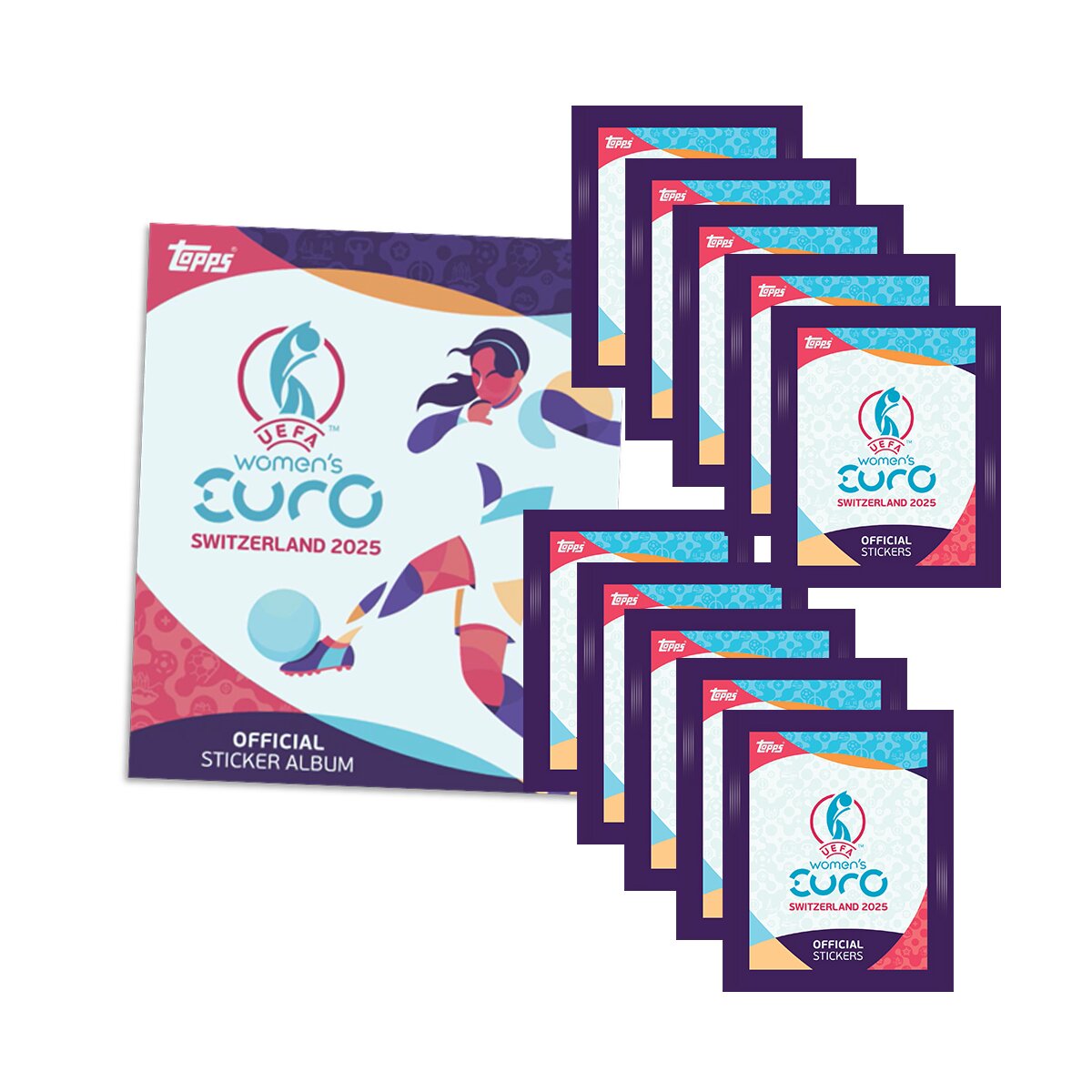 Sie erhalten Album und 10 Tüten zur Serie Topps UEFA Women's EURO 2025 Switzerland. 1 Tüte enthält 6 Sticker